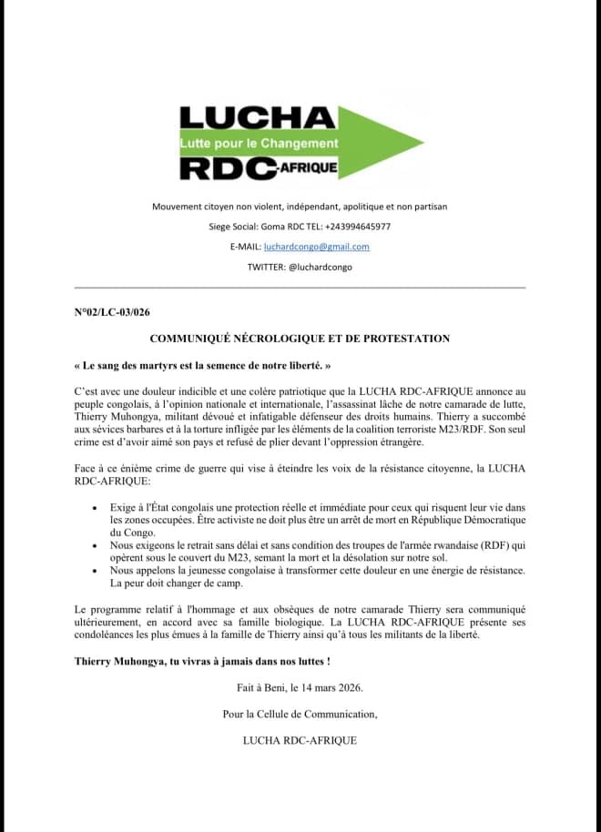 Kinshasa, 15 mars 2026- Le mouvement citoyen Lutte pour le Changement (LUCHA) a annoncé, samedi 14 mars, la mort de l’un de ses militants, Thierry Muhongya, qu’il accuse d’avoir été torturé puis tué par des éléments de la coalition rebelle Mouvement du 23 mars (M23) appuyés, selon lui, par l’armée rwandaise (RDF), dans l’est de la République démocratique du Congo.